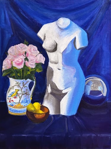 Later, in art history, I learned that still life paintings were used for hidden narratives. The narrative rested in what objects were included. For example, wilted flowers symbolized morality. Knowing this, I got very excited about this class as I imagined stories behind my pieces. Let's imagine together!